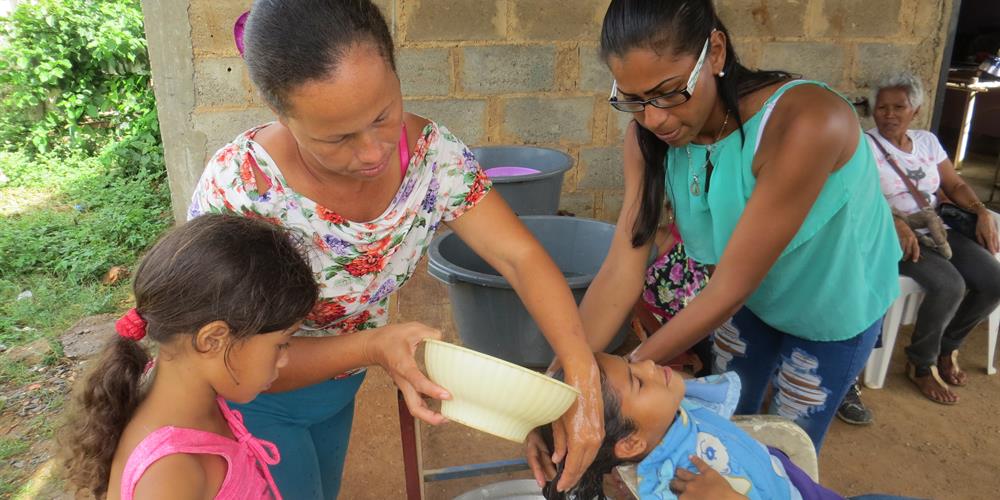 Photo: Roselyn Rodriguez and Arli Rojas wash Silmarys Rodriguez’s hair at Community of Peace Mennonite Church in Isla Margarita, Venezuela. In foreground, Jazmin Tormes waits her turn. Photo by Linda Shelly.