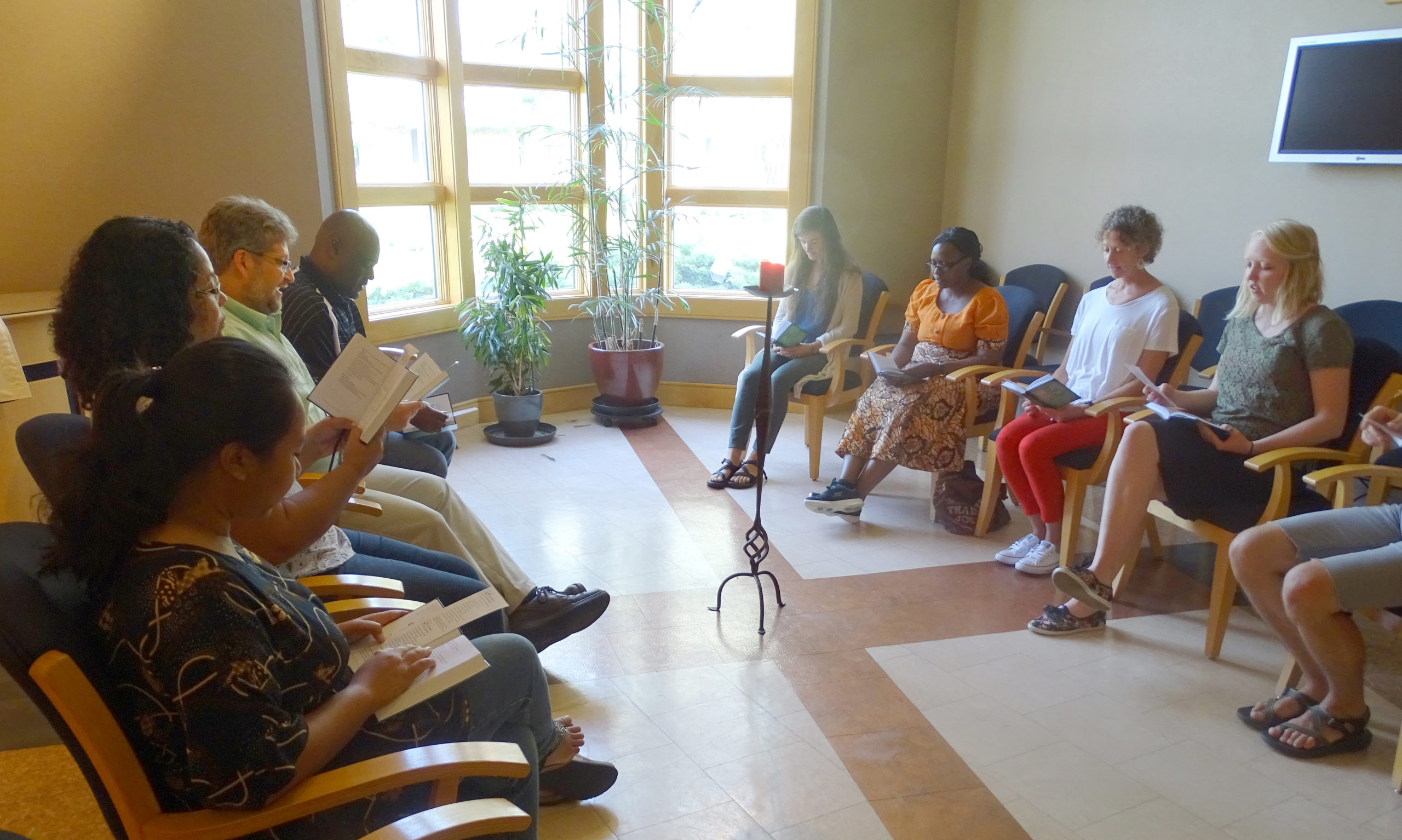 Photo: Members of the AMBS community gather in the Chapel of the Word for weekly prayers with Take Our Moments and Our Days, an Anabaptist prayer book published by Herald Press in collaboration with the Institute of Mennonite Studies. (Credit: Annette Brill Bergstresser)