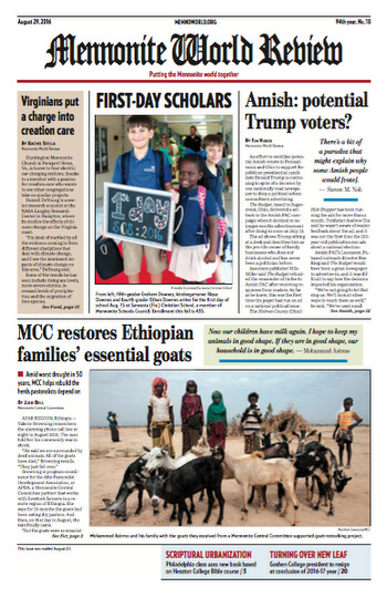 MWR received a first-place Award of Excellence in “art/design/graphics: newspaper front page” for the Aug. 29 issue (pictured above). The judge said the page “powerfully shows the reach and vision of Mennonites” with “an enticing mix of stories. Yet the page doesn’t neglect a homey touch — running a caption-only photo of two smiling preteens on their first day at a Mennonite school in Sarasota, Fla.”