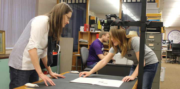 Bluffton senior Dana Otto, right, helps archives and special collections librarian Carrie Phillips prepare to take a digital photo of an issue of the former student newspaper The Witmarsum in Musselman Library. Kenny Beeker, back, will then scan the photo for the Bluffton University Memory website.  — Bluffton University