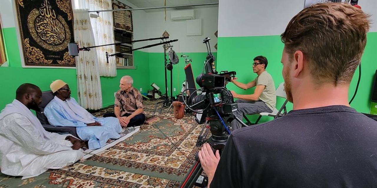 Jonathan Bornman, center, interviews Serigne Afia Niang for the film, “Unexpected Peace,” at the Naylul Maraam Islamic Center in Harlem. — D. Michael Hostetler