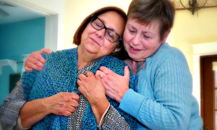 Val Papple, St. Albert, Alberta, (right) gives MDS client Connie Carlberg a prayer shawl at her home dedication service in Walton County, Fla. Papple, MDS volunteer, made the shawl just before arriving in Florida to volunteer with MDS.