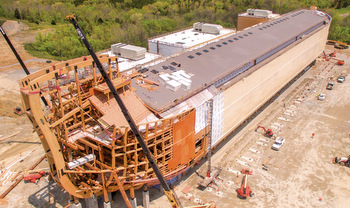 The replica of Noah’s ark, shown here on May 16, is 510 feet long, 85 feet wide and 51 feet high, based on the cubit measurements God gave Noah in Genesis. It is the centerpiece of a $150 million theme park being developed by the Creation Museum in Kentucky. — Answers in Genesis