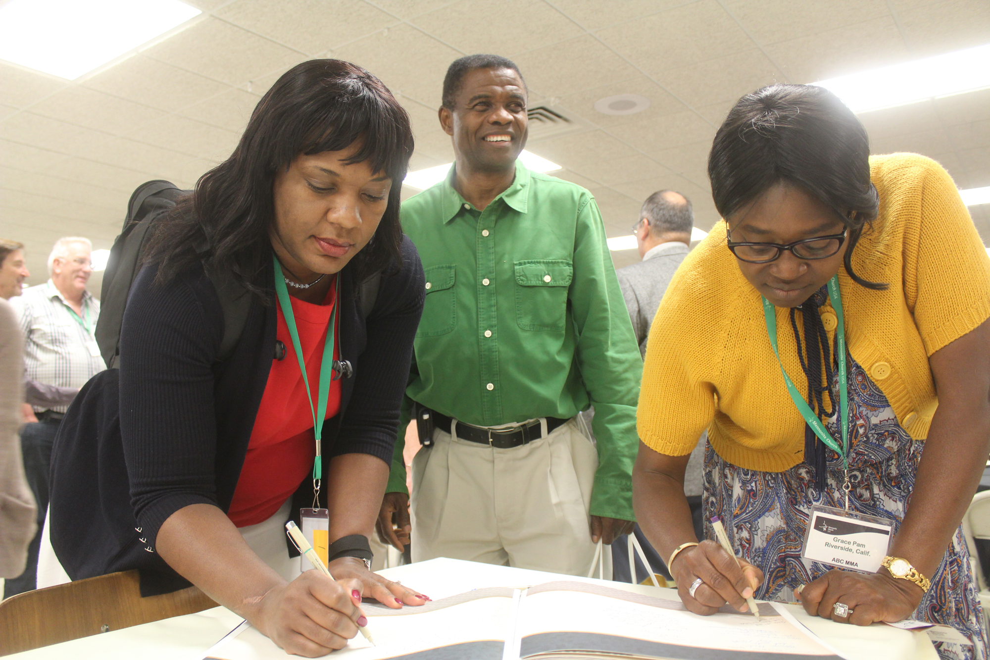 Photo: Alicia Manning, left, of the African American Mennonite Association, and Grace Pam of the African Belizean Caribbean Mennonite Mission Association sign a memory book for Ervin Stutzman, who is retiring as executive director of Mennonite Church USA, as Femi Fatunmbi of the ABCMMA looks on. –Alex Woodring/MC USA
