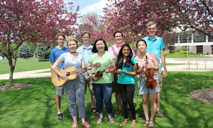 Photo: Front row (L-R): Lauren Myers, Rebecca Choi, Sharada Weaver, Yejin Kim. Back row (L-R): Matthew Smucker, Julian Harnish, Jonah Yoder, Aidan Friesen (Photo by Sadie Gustafson-Zook)