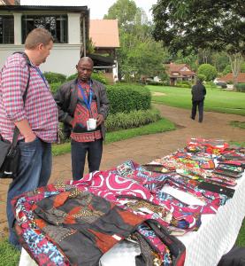 Photo: Safari Mutabesha Bahati speaks to Peace Commission secretary Andrew Suderman about the products from the women’s sewing collective at the Mennonite World Conference meetings in 2018. Photo by Karla Braun.