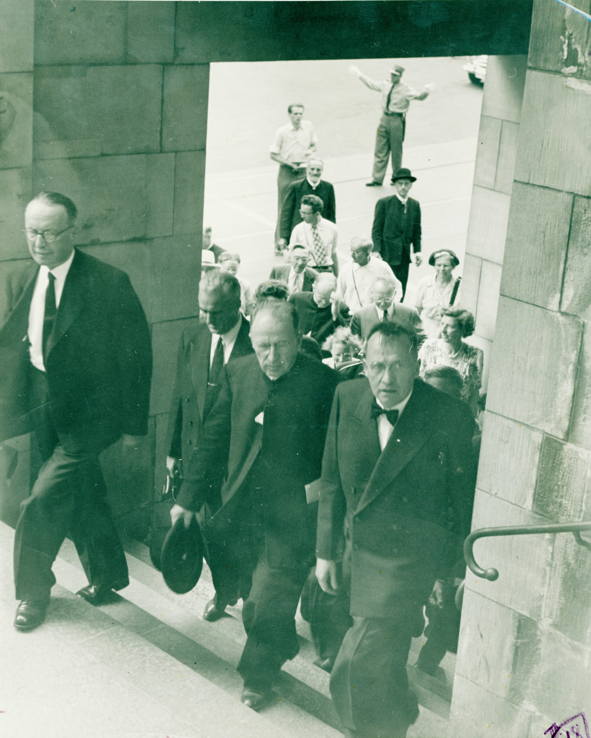 Photo: H.S. Bender (front, center) enters the Grossmünster in Zurich, Switzerland, in 1952.