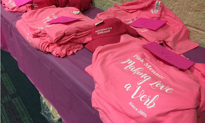 Photo: Pink Menno gear for the Mennonite Church USA convention in Orlando carried the tagline, “Making love a verb since 2009.” Photo from Pink Menno Facebook page.