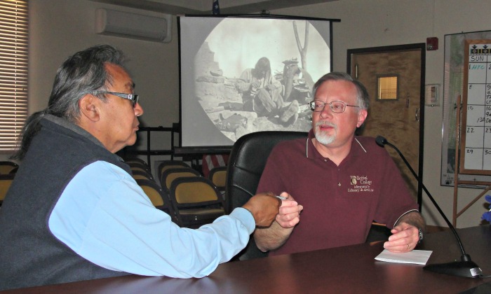 John Thiesen, right, from the Mennonite Library and Archives at Bethel College, hands a flash drive to Leigh Kuwanwisiwma, the Cultural Preservation officer for the Hopi tribe, at a meeting with the Hopi Tribal Council. On the flash drive are digitized film negatives and glass lantern slides, most of them taken by H.R. Voth, a General Conference Mennonite Church missionary to the Hopi in the late 1800s. Playing behind the two men are about 30 of the slides in a PowerPoint that Thiesen put together ahead of time. Photo credit: Louella Nahsonhoya/The Hopi Tutuveni.