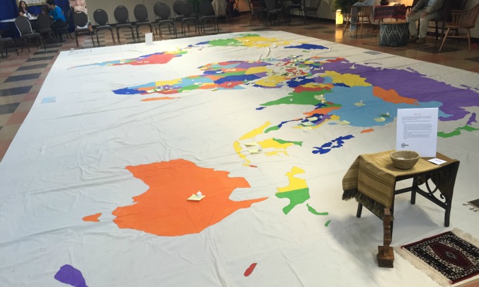 Photo: A large map on loan from Rosedale Bible Missions, Irwin, Ohio, dominated the prayer room at Mennonite World Conference Assembly Gathered this summer: a tangible way to touch the world with supplications and praise. Photo by Kristina Toews.