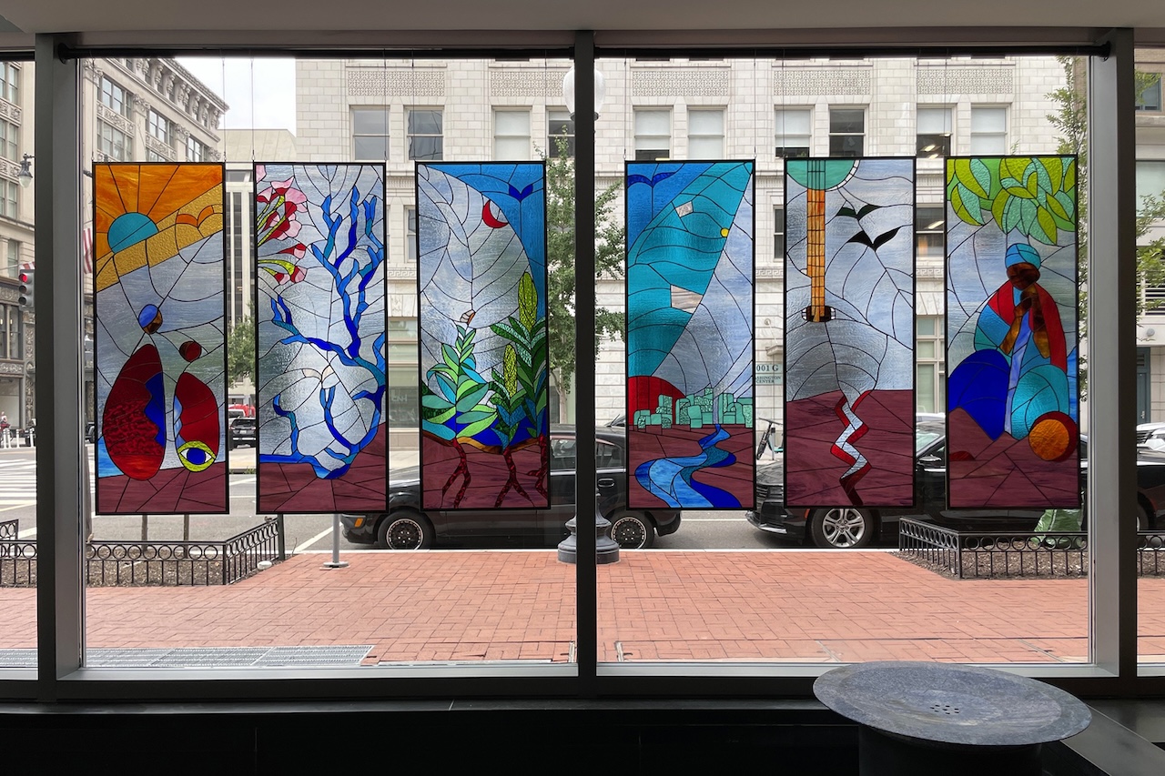 Harrison said the artist’s choice of stained-glass panels, which hang from a ceiling in front of clear windows, is fitting.