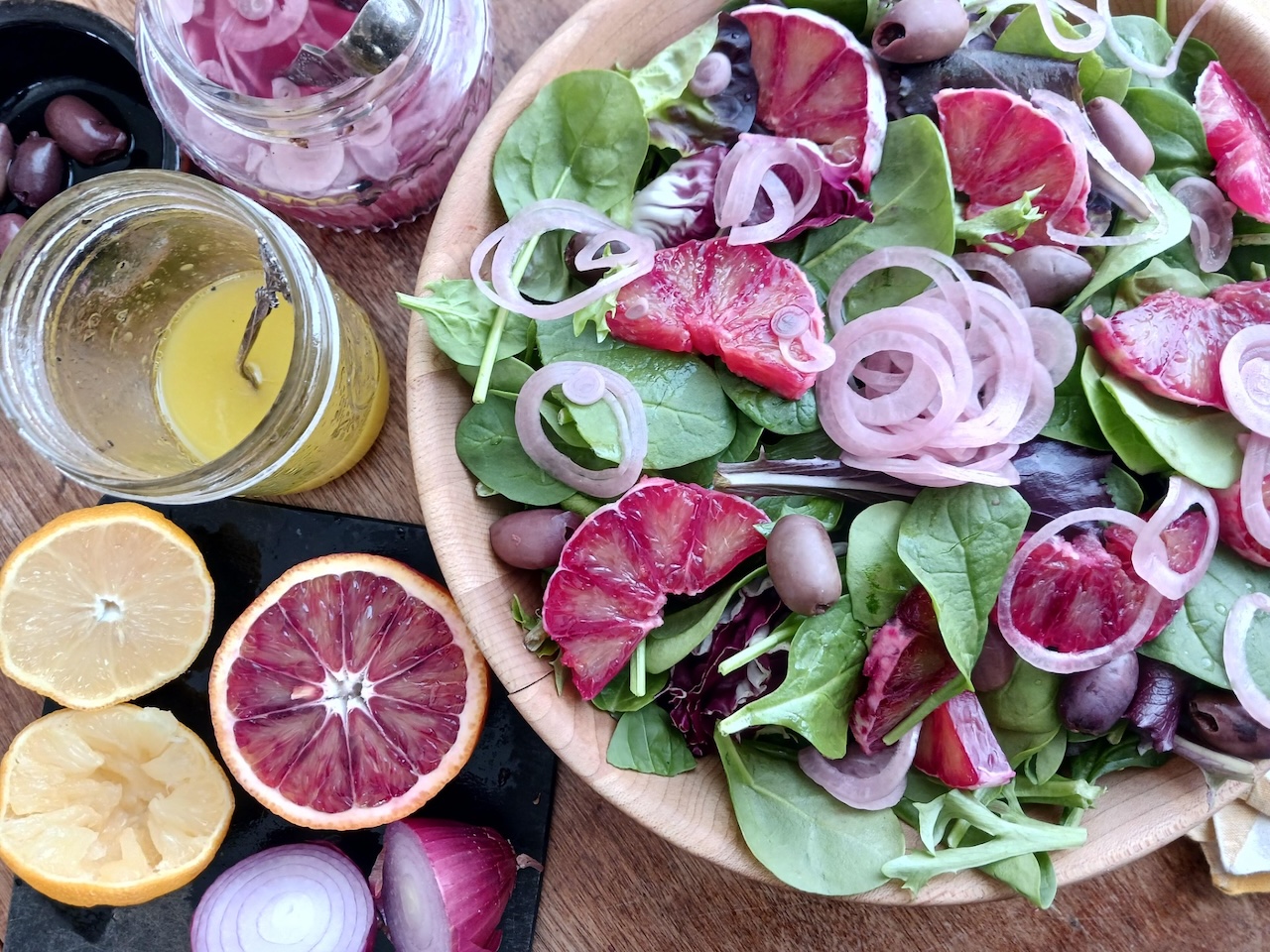 This simple salad features seasonal fruit that will brighten a winter’s day. All ingredients began as seeds with some (olives and oranges in particular) maturing to be the fruit of trees. Maybe next year I can make this using sea kale!