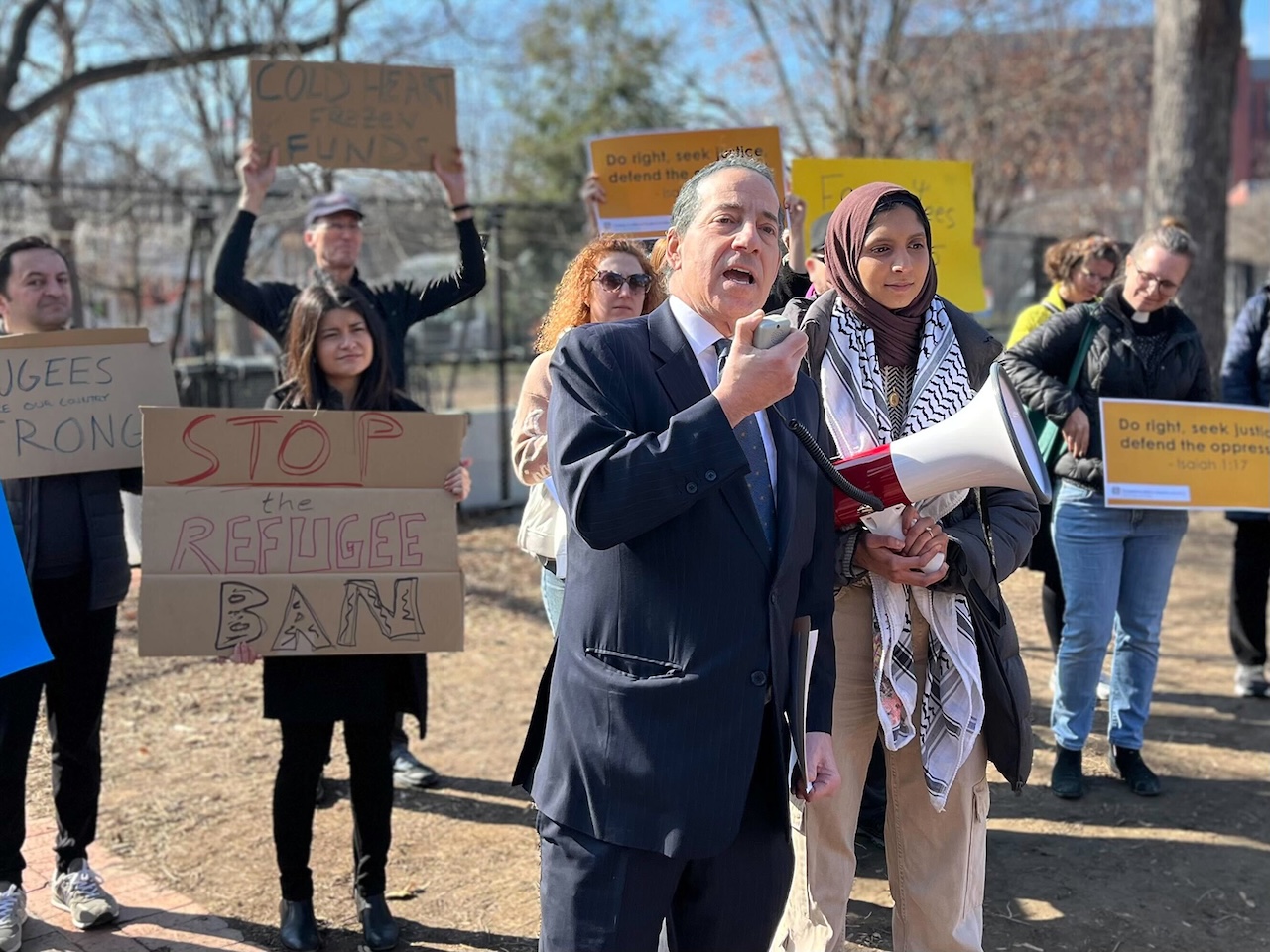 Although the U.S. Refugee Admissions Program has received bipartisan support in the past, Republicans have not publicly protested Trump’s shuttering of the program or his allies’ denigration of faith-based aid. U.S. Rep. Jamie Raskin, a Maryland Democrat, was greeted at Tuesday’s rally by shouts like “I’m so proud you’re my congressman” as he took the bullhorn and called Trump’s decision “ to slam the door shut on refugees” a “ betrayal of America and our values.”