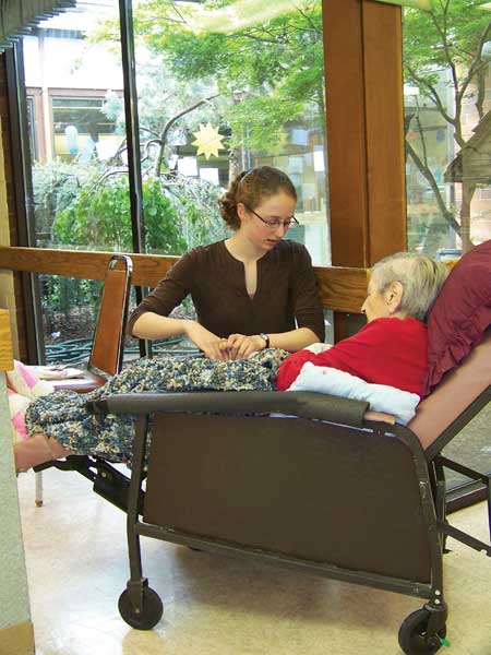 Service Adventure volunteer Maria Martin helps a resident at Mennonite Village in Albany, Ore. Photo provided