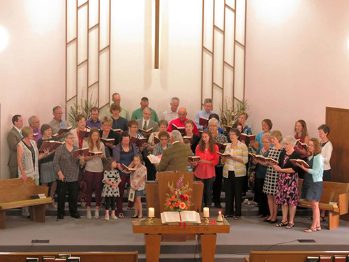 Photo: An impromptu choir sings at Salem’s 125th anniversary celebration, led by John Lauber. While worship now includes musical instruments, the congregation still has a strong tie to a capella singing. Photo by Lisa Hendrickson.