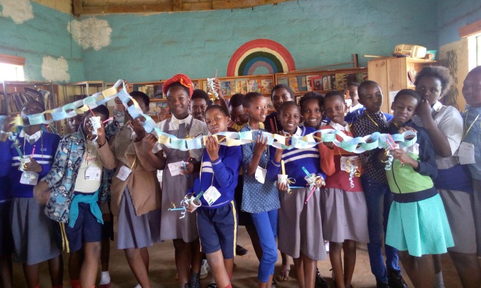Caption: Girls show off the word chain they created on the final day of their week at a girls empowerment camp organized by two 2016-2017 participants in MCC’s Serving and Learning Together (SALT) program. Each girl was given three links on which they wrote things they learned about themselves or about being a girl throughout the week. MCC photo/Renae Stucky