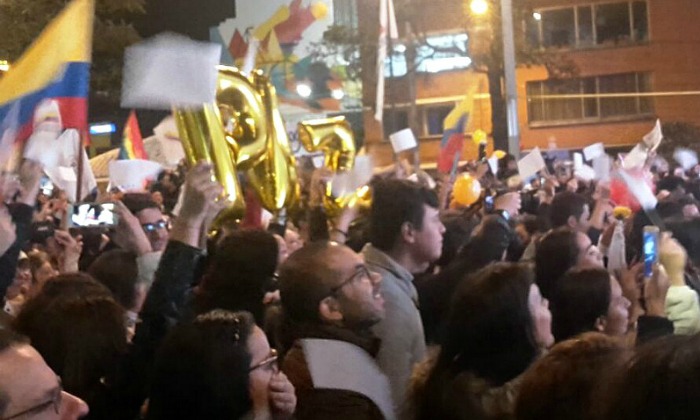 Photo: On Aug. 24, Colombians celebrate during the announcement that an agreement has been reached between the government and FARC guerrilla group, ending the longest-running conflict in the Western hemisphere. (Photo courtesy of Mencoldes Foundation)