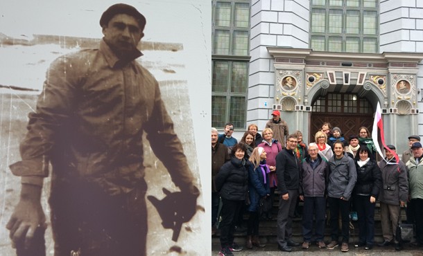 Ralph Witmer (left) was a “seagoing cowboy” with Brethren Relief Services in 1946. In Nov. 2015, he traveled to Poland with his son, Nelson Witmer ‘87, and Nelson’s son, Alex, class of ‘15, where they were greeted with a reception of town officials and even relatives of those who had benefited from Witmer’s work (right). (Courtesy photos)