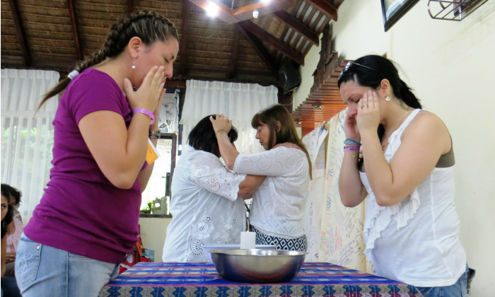 Marcia Soto and Alejandra Molina (foreground) and Estela Armoa and Aurora Rinaldi give and receive prayers and blessings at a Sister Care gathering in Bolivia. Photo provided.
