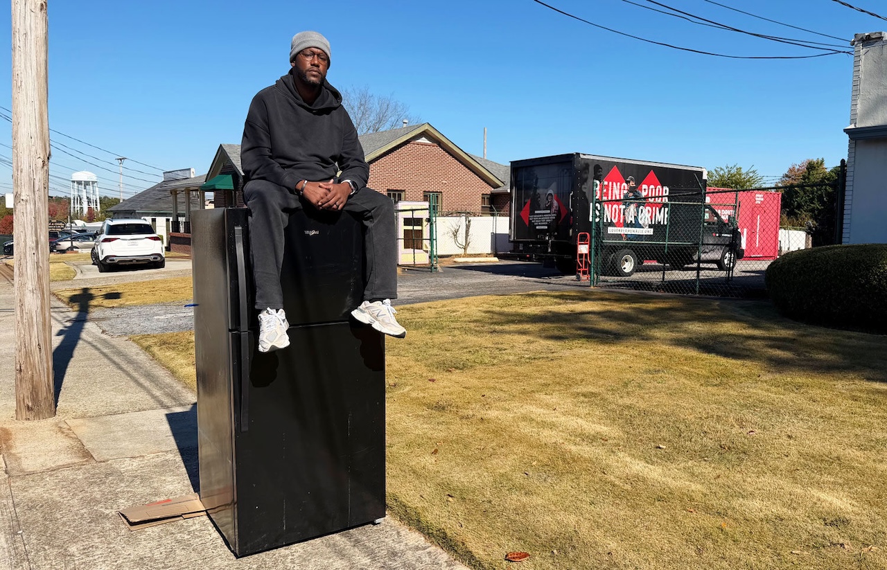 Terence Lester, wearing a black hoodie and a beanie, sat atop a tall, black curbside refrigerator in the Atlanta suburb of College Park, Georgia, on a sunny Tuesday afternoon in November in hopes of bringing attention to the 42 million Americans who rely on SNAP benefits.