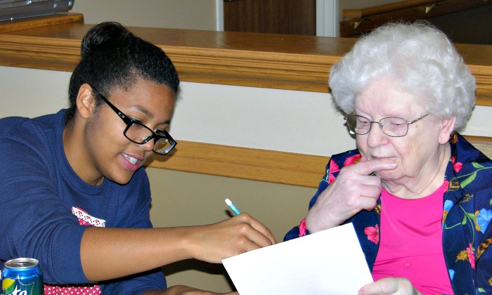 Bethel College freshman Billie Selichnow, left, shares a copy of a reflection narrative she wrote after learning to know Irene Schmidt, right, a resident of Kidron-Bethel Village in North Newton. Photo by Melanie Zuercher.