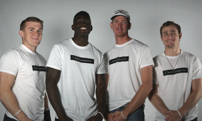 Photo: From left, Grant Walker, Austin Mitchell, Brian Krehbiel and Chase Banister wear their first T-shirt design for their company I Have Purpose (photo by Brian Krehbiel).
