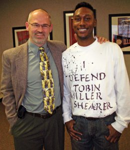 Before I left for Montana, Keith and a half dozen other members of our congregation traveled to Evanston in the middle of the week to attend my dissertation defense. Keith was not the only one who dressed up for the event, but he was the only one who designed his own T-shirt. It read, “I defend Tobin Miller Shearer” (see photo). I was again moved.