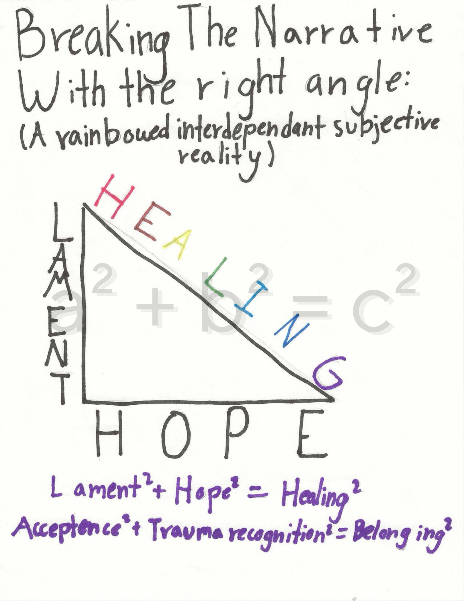 Our idea is that a mathematical formula, like Pythagoras’s theorem, uses different variables to describe some kind of equality. So lament and hope are both factors that, when held together, can bring about, or be equivalent to, healing.