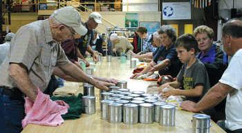 Volunteers clean cans of chicken meat before they are weighed and packed at the Mennonite Central Committee Central States warehouse in North Newton, Kan. — Tim Huber/MWR