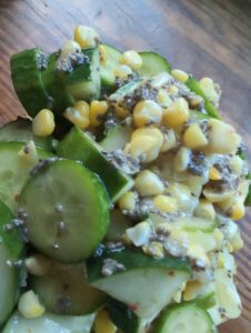 - Mix together sliced cucumbers, corn and seeds in a pretty salad bowl.