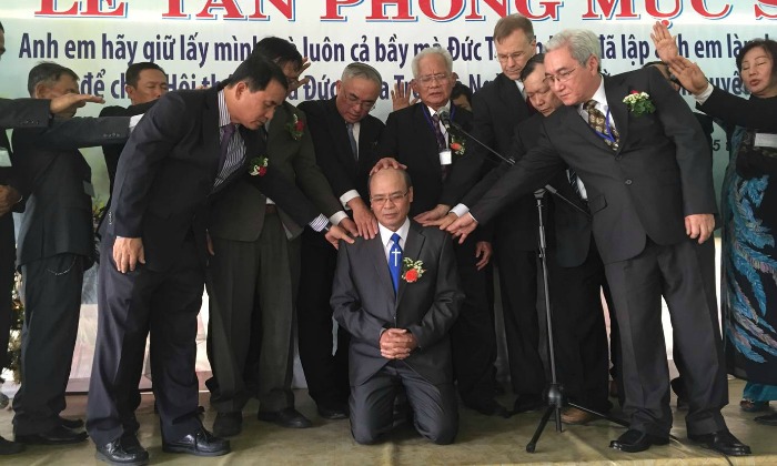 One by one the pastors knelt to receive a blessing and charge as Pastor Trung, Pastor Tuyen Nguyen