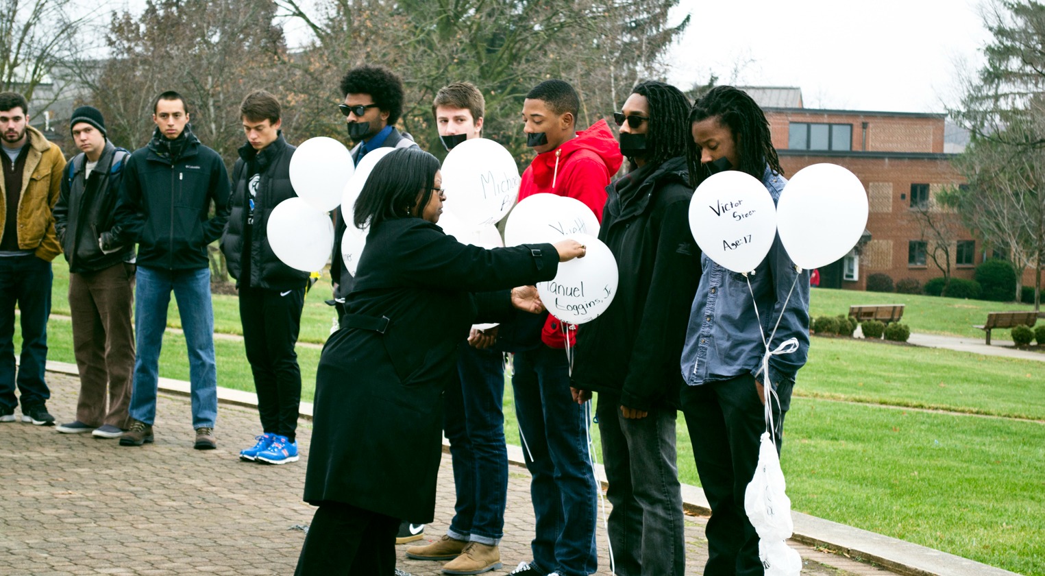 Undergraduates Kaltuma Hassan and Philip Watson read short eulogies for each person’s name written on the balloons at the Dec. 2 vigil. “One black person is killed every 28 hours in America, whether innocent or guilty,” stated Hassan. “Trayvon Martin, killed February 26, 2012. Seventeen years old, shot in Sanford, Fla., allegedly shot in self defense by George Zimmerman.” As they read through 18 names, Thomas went down the line of balloons, popping each as its name was read. “Dante Parker, killed August 12, 2014. Thirty-six years old. Tased to death. Killed by San Bernadino police department.”