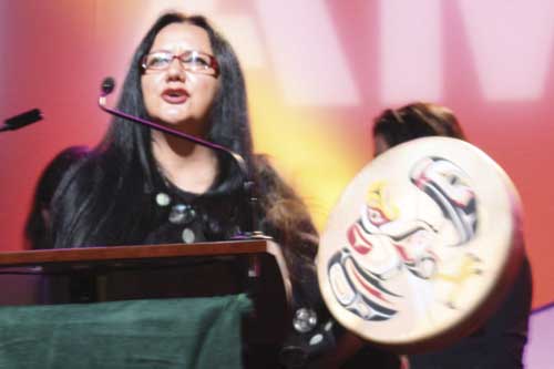 Cheryl Bear, who took his place as speaker, sang a song she wrote in honor of Twiss, accompanying herself on a drum. She then presented bad news and good news.