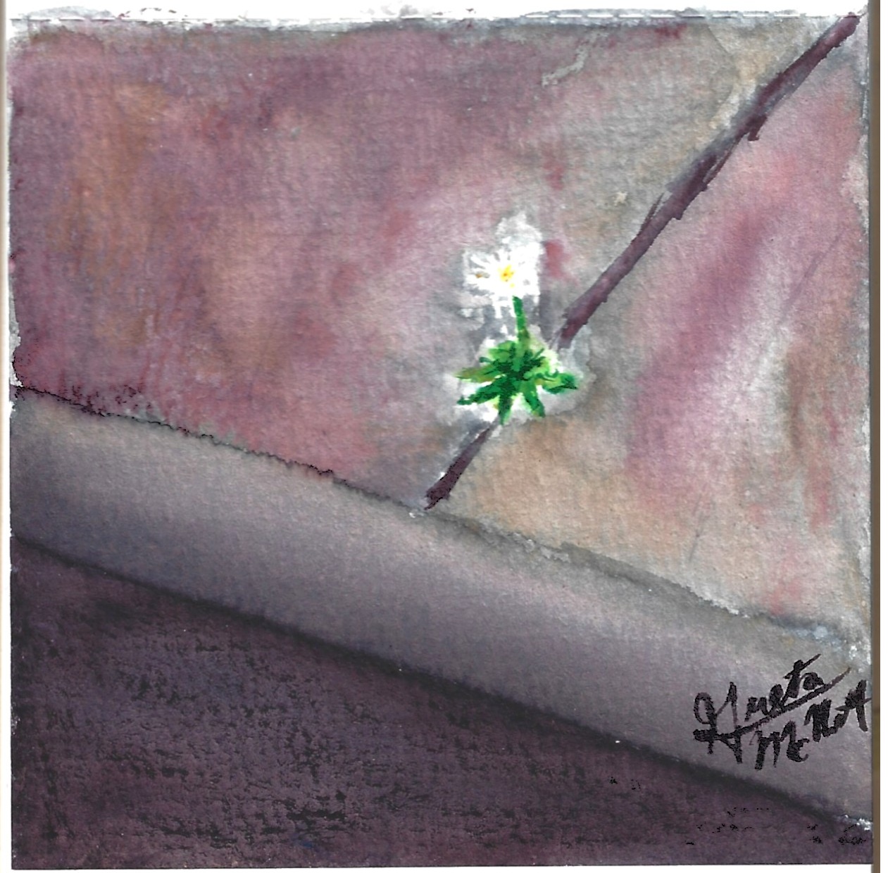 When I thought about the theme of hope, a flower sprouting up from a sidewalk crack was the image that came to mind. I like to bring an art bag along with me in case I have extra time. It’s got a small watercolor set and a mini watercolor paper spiral notebook. I also have watercolor markers and pencils. What is the first image that comes to your mind when you think about HOPE? Make art.