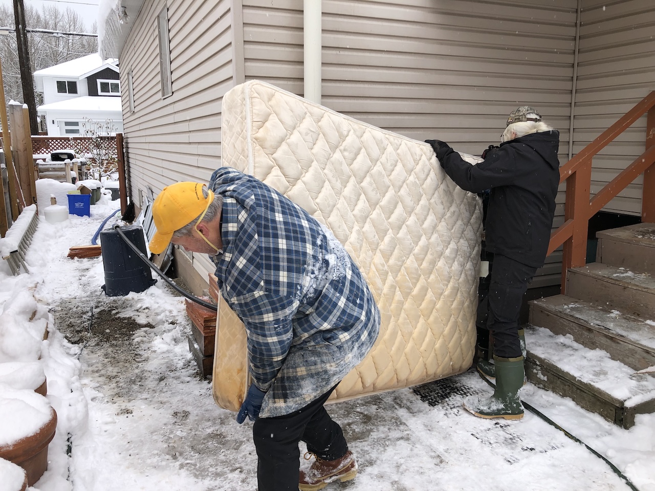 Then back to the camp. We had our meal, told our stories, and then back to it the next day. Just keep repeating until the place was cleaned. We power washed the whole basement until it actually looked pretty good. It was an unfinished basement area. Then proceeded to go upstairs. They’re older constructed homes, so it’s a bit of an archaeological dig because you can be going through drywall, and then you’ll get to the 1970s paneling. Behind that, you’ll get to the Donnacona that they used in the ’50s, to the shiplap, and then to the frozen insulation, which in some cases is sawdust. Some cases it’s nothing.