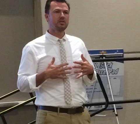 Photo: Josh Packhard speaking at the Mennonite Church USA convention in Orlando on July 5. Photo by Gordon Houser.