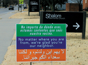 “We hope people who go by the church receive this message in Spanish, English or Arabic, that we want to love them as neighbors,” Bucher said. “It’s also a constant reminder to us as a congregation, that if we say we’re Anabaptist-Mennonite and want to follow Jesus, that’s the second-greatest commandment. This is who we want to be.”